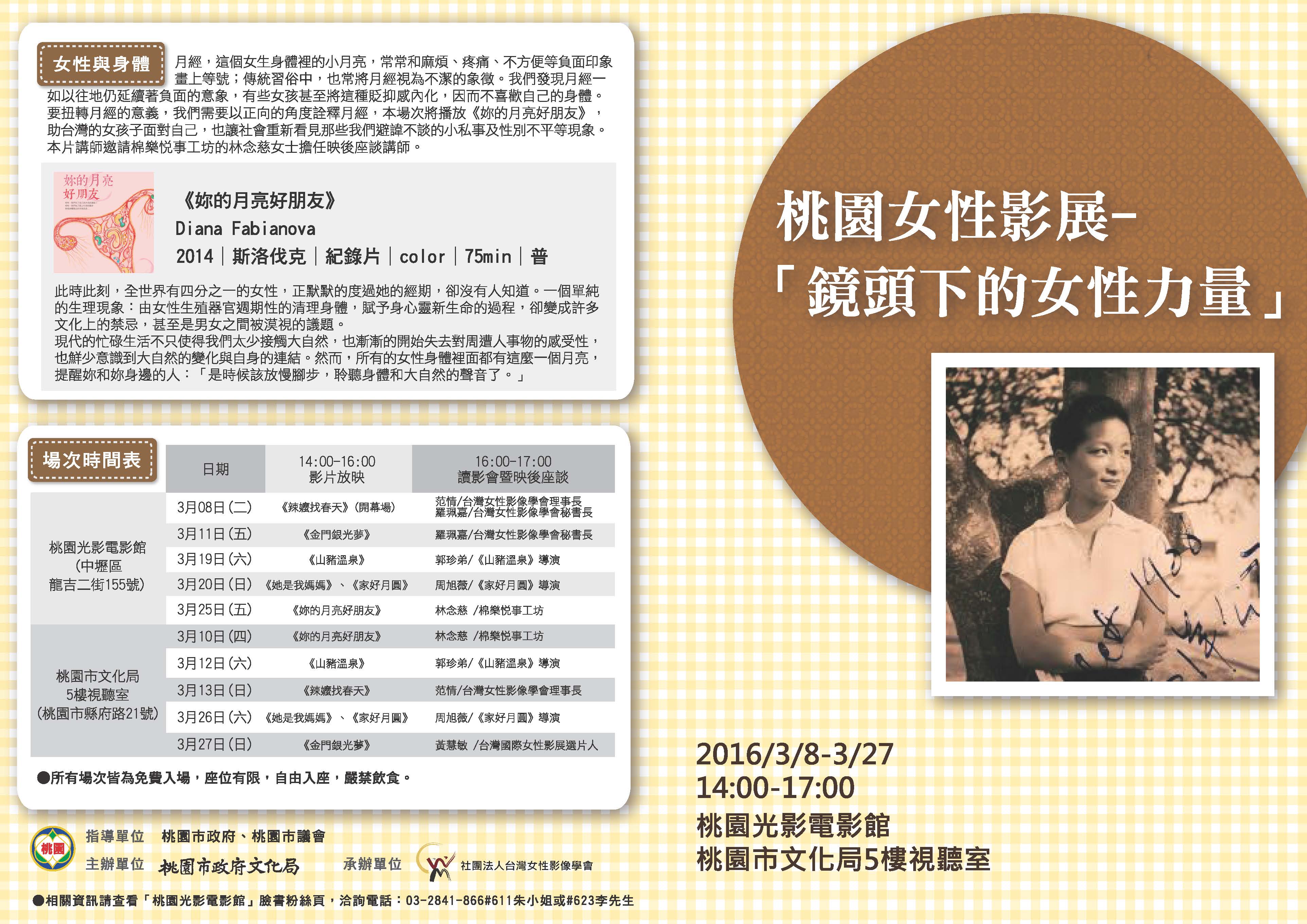 2016桃園女性影展-「鏡頭下的女性力量」,3/8-3/27共10場的放映暨映後座談,邀請講師及與談人與會,帶領觀眾聚焦於影片中的性別議題,進行深度的討論。映後座談中,觀眾往往與導演或講師,討論的欲罷不能,觀眾除了分享自身的經驗,更是踴躍的發表對於影片的觀點與想法,與導演有了許多深刻的互動與對話,使得影展不僅是動態的影像放映活動,而是使觀眾可於討論中進行價值觀的交流,進而啟發多元的思維。這次的活動中不只觀眾的反應熱烈,導演也表示這樣熱烈的討論也成就了她心中一部電影的完成,她認為一部電影完成的過程不只是從攝影、製作到上映而已,需要再加上觀眾觀影後的共鳴才成就一部電影的完成。