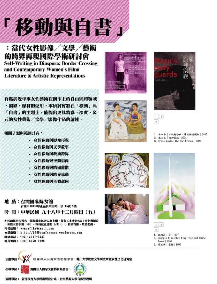 有鑑於近年來女性藝術在創作上的自由與跨領域、疆界、媒材的使用,以及女性藝術工作者與策展團隊間,姊妹情誼的感染、跨介的結盟,本次研討會將結合當代女性視覺藝術、影像藝術與文學等多面向領域,進一步探討兼具「移動」與「自書」兩大主題的女性文學/藝術/影像之作品。本計畫由具有長年舉辦女性影展有成的社團團體台灣女性影像學會與輔仁大學比較文學研究所共同合作,希冀透過結合女影學會在實務、策展上的豐富經驗與比較文學所博士班在跨藝術、跨領域所累積的學術成果,呈現當代女性藝文活動的推廣與學術領域的深度探尋,朝向多元且精闢的影像、藝術與文學的跨界綜合研討會邁進。希冀在「移動」與「自書」的主題上,能提出精彩、深度、多元的女性藝術╱文學╱影像作品的論述。